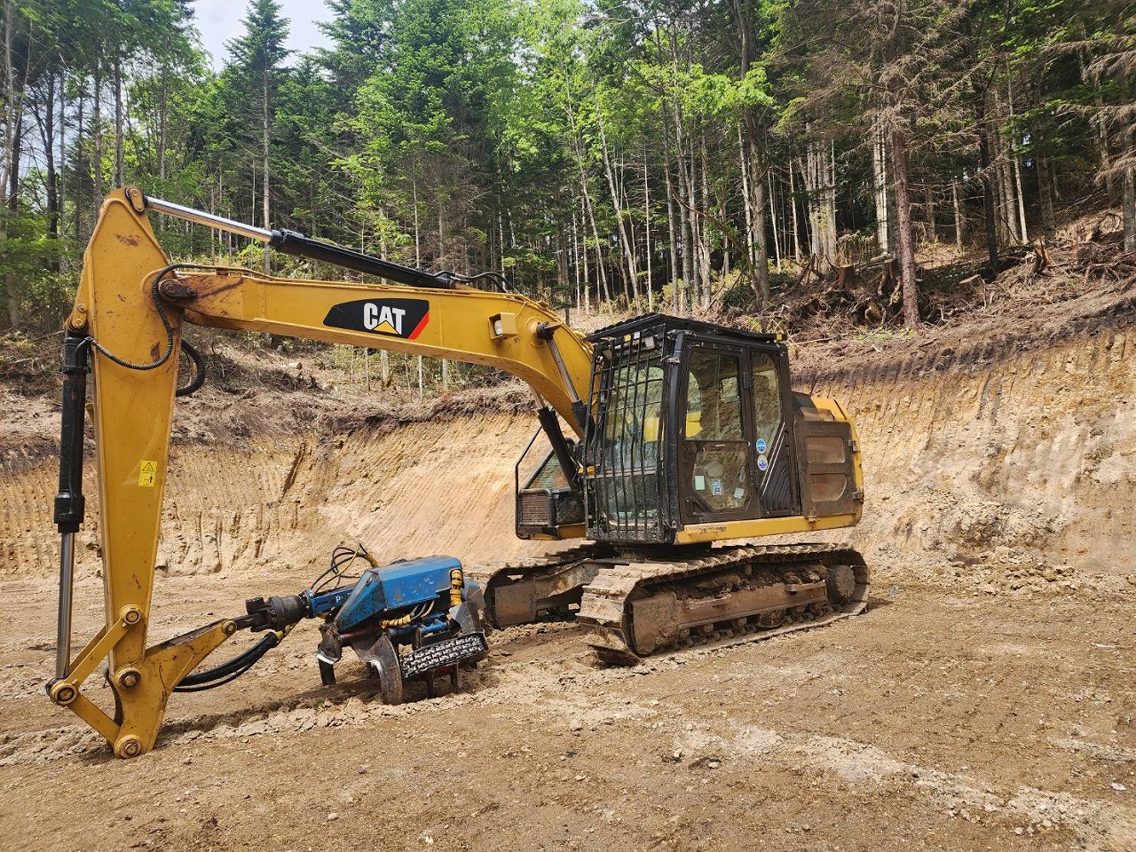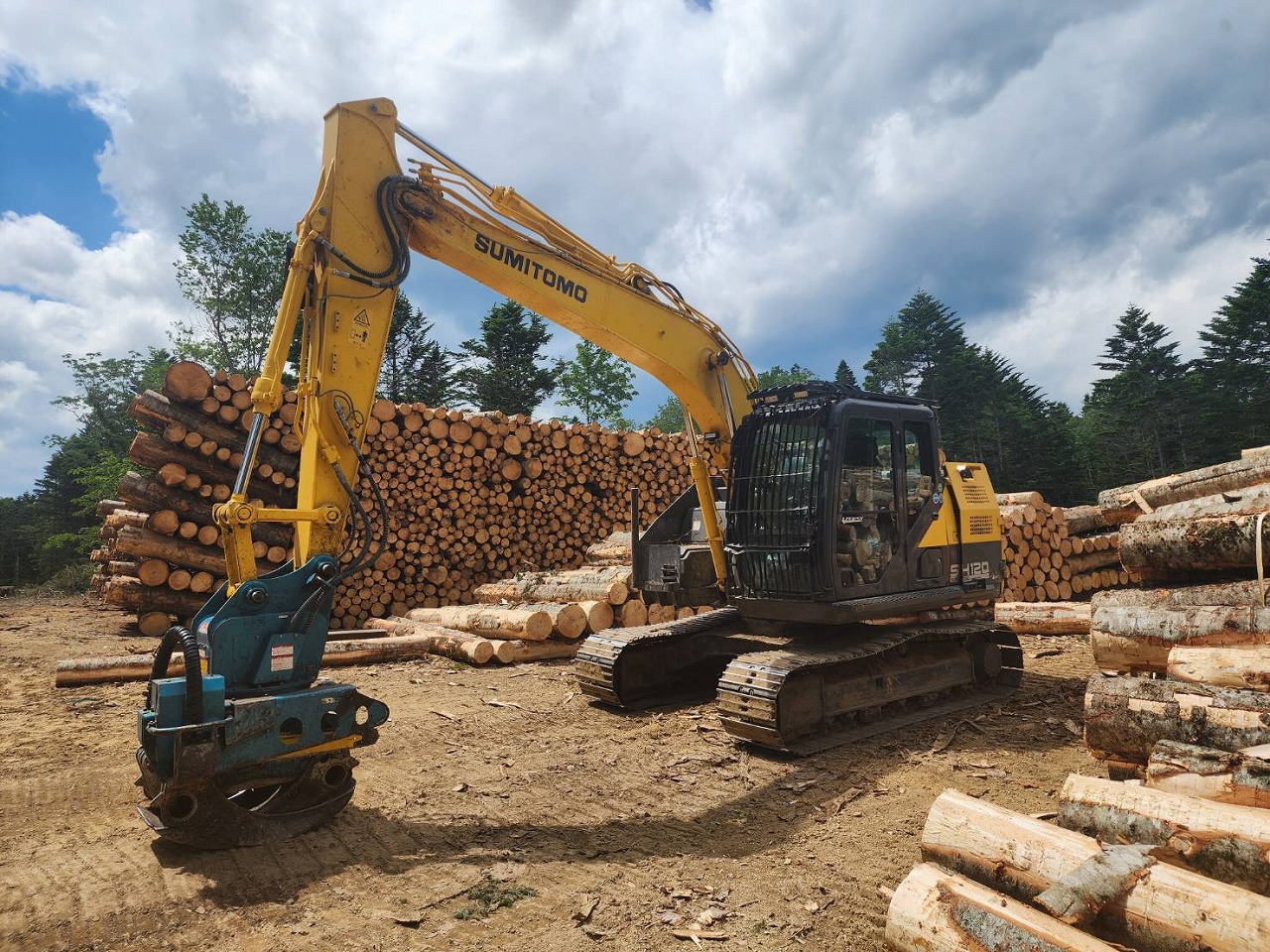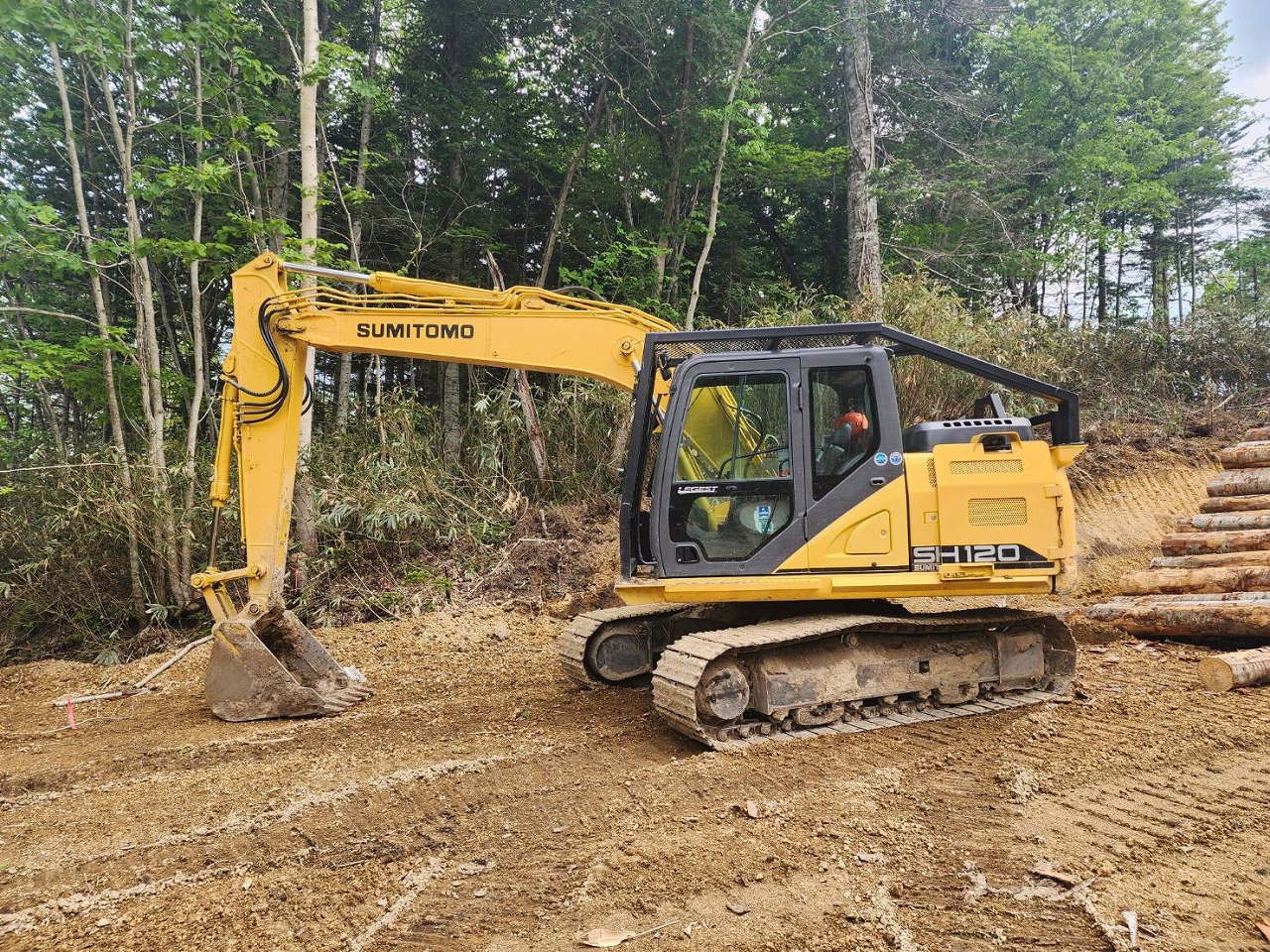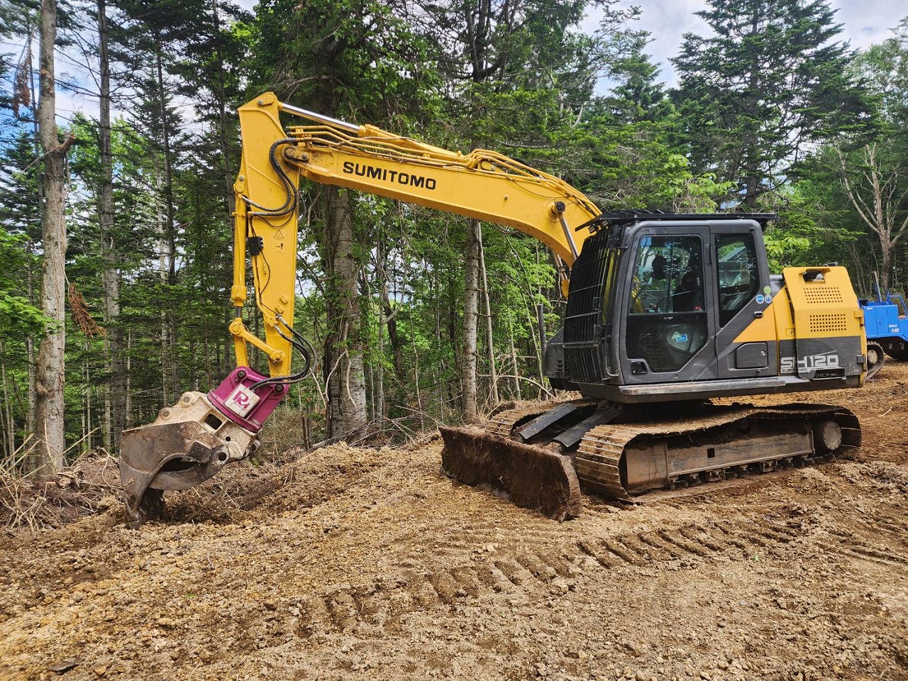 SH120-6に装着されたイワフジ製グラップルは、伐採現場での木材の掴み・運搬作業に最適なアタッチメントです。強力な掴み性能とスムーズな動作で、集材や積込作業を効率化。狭い現場でも高い操作性を発揮し、省力化と安全性向上に貢献します。