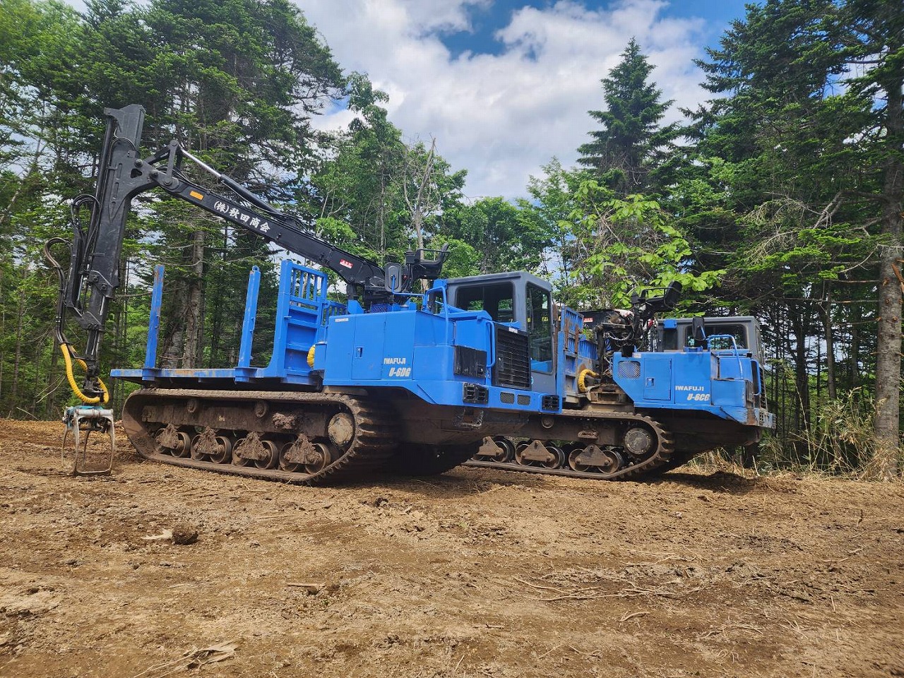 イワフジのU6DGは、グラップルローダを搭載した6トン積載の林業用フォワーダ。伐採木を掴んで積載・運搬まで一台で対応可能です。U6CGは運搬特化型で、大量の木材を効率よく輸送するのに最適。現場のニーズに応じて選べます。
